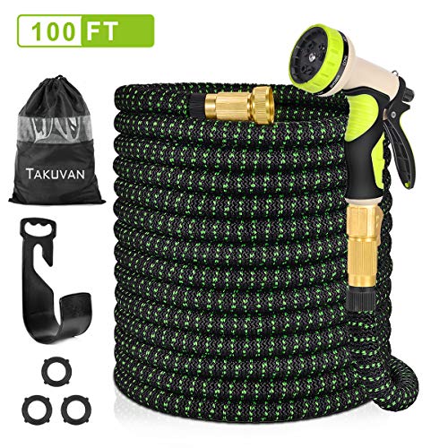 ☘️DURABLE EXPANDABLE GARDEN HOSE: Covered with good quality and wear-resistant material to avoid kink, burst or become tangled. Strongest triple layer latex core and 3750D polyester fabric, making it quite wear-resistant, lightweight, flexible and long enough to make it easy and convenient to maneuver around garden. 3/4" tough brass connector with strong rubber seal gasket design make your hose no more leaks. Help you save time, money and water resources., ☘️FLEXIBLE, LIGHTWEIGHT AND COMPACT: When the water is turned on, the flex expandable garden hose expands rapidly to 3 times its length (100 feet) under the pressure of the water and shrinks back to its original length when closed. We offer a bonus hanger & bag, which will help you keep this garden hose easily and take up a little space., ☘️EASY TO USE: The rotating bezel design of the nozzle makes it easier to choose kind of spray, which is suitable for children, people with wrist discomfort, and the elderly. Pull the Trigger Buckle to keep the water flowing and effortless. A brass switch valve makes you conveniently to stop the water without turning off the tap, saving time and effort, making the retractable garden hose easier and simpler to use., ☘️MULTI-FUNCTION NOZZLE: The sprayer boasts non-slip and comfortable grip and rotating bezel for choosing 9 spray patterns-JET CENTRE CONE MIST SHOWER FULL FLAT ANGLE SOAKER. Including multiple adjustable watering patterns, great for house/car/floor/yard washing, garden watering, pet showering, having fun or business use., ☘️RISK-FREE SATISFACTION GUARANTEE: We guarantee a replacement for any Garden Hose that has a manufacturing defect within 12 months of purchase and give a 60-day money-back guarantee. If you ever have any issues with your Takuvan hose, simply contact us!