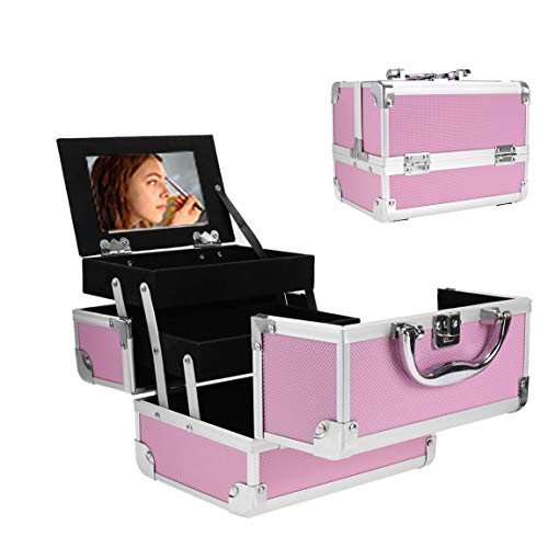 [Spacious & Functional] This makeup train case comes in a highly spacious and functional design with a large bottom compartment, two cosmetic trays, and a mirror panel attached. Its large capacity fits all your lipstick, nail care kit, foundation, brush, palette, eyelash and other accessories. A good size mirror lets you have an easy makeup., [Durable Material] Constructed of high quality aluminum frame with reinforced corner protectors, our makeup case is sturdy enough to survive falls and collisions while well protect makeup and mirrior inside from damage due to its velvet liner trays. It’s made for long time use., [Safe Lock For Privacy] A safe locking mechanism with two keys serve to guard for your personal grooming articles. Even when fully loaded, the box keeps buckled, no need to worry about its embarrassing bursting open., [Easy to Clean] Top-grade ABS plastic surface allows an easy maintenance as a damp cloth can easily wipe the exterior clean. ABS plastic surface also has great performance in abrasion resistance which helps the organizer maintain a good looking., [Easy Mobility] A chromed swivel handle facilitates you to take it anywhere you want. 8"L x 6"W x 6"H & 1.25kg net weight are perfect for traveling and going out to work.