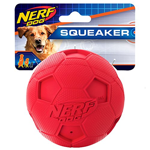 NERF TOUGH Nerf quality materials make our Soccer Squeak Ball toy perfect for fetch and for teaching your dog new tricks, EASY HANDLING The unique pattern on the outside creates ridges that make it easy for your dog to pick up and fetch, while the hexagon texture on the outside makes it easy for humans to grip and toss, MADE TO LAST Lightweight, durable, and weather & water resistant, FOR MEDIUM AND LARGE BREEDS 4 inch ball is ideal for medium and large breeds, SAFETY FIRST Designed with you dog's safety in mind, each of our dog toys are tested to ensure endless hours of family fun