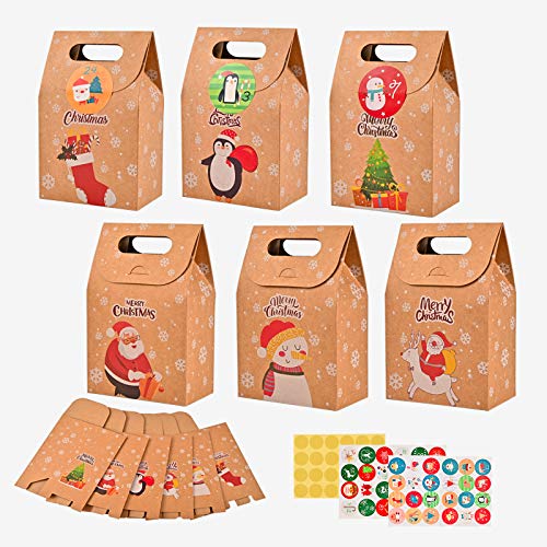【Easy To Assemble】 3 cute cartoon stickers provided for free, which including: 1. Animal calendar sticker, 2. Christmas calendar sticker, 3. Transparent sticker. To easier assemble, please follow the assemble steps and paste the stickers on the top and bottom of the Christmas gift bag., 【Perfect Size For Small Gifts】 Each Christmas goody bags measures 4* 3* 6 inch, 24 PC gift bags Christmas are wonderful choice for packing candy, small toys, Chocolate, DIY cookies, foods, small breads, nut and other Christmas small gifts., 【6 Different Christmas Characters】 Christmas small gift bags printed with 6 classic characters, including Christmas tree, Penguin, Christmas stocking, Santa, Snowman, Elk and with cute snowflake design. They are deeply loved by kids and adults in the Christmas holiday party., 【100% Kraft Green Material】 The Christmas gift bags small are made of 100% Kraft, which is strong, environmentally friendly, recyclable, and safe goods material with high tear strength. Please use them with confidence, without scruples., 【24-Hour Online Customer Service】 If you have any problems during using or assembling the Christmas cookie bags, please contact us in time, we will solve your problems preferentially. And we will provide you with satisfactory after-sales service.