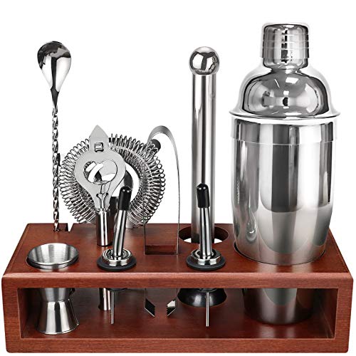 10-Piece premium bartender set provides professional bar accessories you need for mixing delicious cocktails & mocktails: 24 oz cocktail shaker, Bamboo stand, double jigger 0.5/1 oz, Mojito Muddler, Mixing spoon, Hawthorne strainer, 2x Liquor Pourers, Ice tongs, Bottle Opener, recipes guidance., Classic bamboo stand: The bamboo stand keeps your bar tools and accessories scratch-safe and organized., TOP RUSTPROOF STAINLESS STEEL: The bar kit is made of quality stainless steel 304 18/8. Top-quality guaranteed., Easy to Start: Perfect for bartender beginners and professionals, you can create drinks that made from a wide variety of liquors with this professional Cocktail/Martini shaker, including Mojito, Martini, Margaritas, Whiskey, Scotch, Vodka, Tequila, Gin, Rum, Sake and more. You can use it for mixing any kind of drink you want. Recipe cards help beginner starts your cocktail mixing easily., PERFECT GIFT: It's a perfect gift to families and friends, they absolutely will fall in love with it! If you have any question about the bar kit, please feel free to contact us at any time.