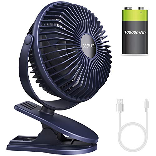 Long Working Time Battery Fan & 2A Fast Charging —— Built-in 10000mAh powerful battery, lasting work up to 8-36 hours (depending on its speed). More longer battery life than others small fans. An integrated-circuit with high-speed charging, just charge in 4 hours with the 5V/2A adapter (not included)., Strong Airflow Fan& Low Noise —— This clip fan small but mighty, built-in 2020 new upgraded motor for faster operating speeds (2400rpm-4200rpm). Feeling the blast of the strong airflow from 10 ft away. The quiet fans advace optimized blade design engineered to be 25% Quieter. The minimum noise is close to 20dB. It will not disturb you when you are working or sleeping., Strong Grip Clamp Fan —— Up to 2.5 inches maximum clip opening and strong clamp for firm grip, easily clip on any surface, even running upside down and still be adjusted to point in every direction. Moreover, the clamp is designed with non-slip rubber mats, even the minute scratches won’t be there on the surface where it is to be clamped., Portable Fan & Compact Size —— 8*5.9*3.5 inches mini size, lightweight, portable and handy. Ideal for bady Stroller, golf cart, comping, bedroom, kitchen, desktop, gym workout, BBQ etc. You will love it and no longer complaining about the hot weather.