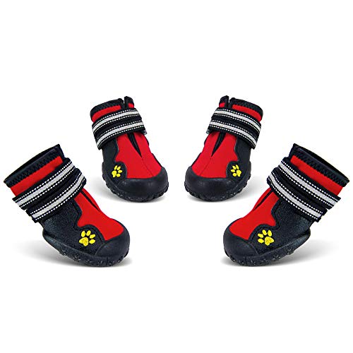 Water-resistant material and warm lining. Keep the paw warm and dry in snow and cold weather., The reflective straps for better visibility in the dark., Nonslip rubber sole is durable and comfortable. Protect the paw from ice, salt, sharp rocks, broken glass., Nice choice for winter, snow, hiking, running, walking, indoor, outdoor activity and so on. Design for medium and large dogs., Please measure the paws before ordering. If the size is not suitable, please contact us!