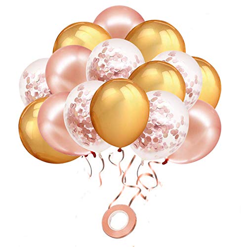 🎈【60 PCS BALLOONS】: The rose gold balloons set includes 60PCS (12 inch round balloons)with a bonus gift of 11 yards rose gold curling ribbon free to give your party a bling look. You will receive 30pcs rose gold balloons, 20pcs clear confetti Balloon, 10pcs gold metallic balloons, with a sweet gift of 11 yards rose gold foil ribbon and 1pcs square towel absolutely free., 🎈【HOW TO MAKE BEAUTIFUL BALLOON】: Our confetti balloons come prefilled with rose gold confetti. The confetti balloons can fill with both Helium or Air, shake the confetti balloons and you can gently rub them with towel. this will generate friction and the confetti will stick to the side. this will make the balloons look more beautiful. After parties, you may pop the balloons and let the confetti fall all over which increase lots of fun to the party!, 🎈【PERFECTLY CURATED GOLD BALLOONS FOR BRIDAL SHOWER DECORATIONS | BABY GIRL SHOWER | BIRTHDAY PARTY | WEDDING DECORATIONS】: Our glitter balloons for birthdays, wedding party, home party, baby shower, bridal shower, graduation, retirement party, festival party decorations. The gold metallic, rose gold and clear confetti balloons are very popular by people, it make your party gorgeous and stylish., 🎈【SAFE MATERIAL】: The rose gold latex balloons made of high quality latex material which is durable, long-lasting. It's non-toxic and Eco-friendly, safe to be used for both kids and adults. With one roll superior rose gold ribbon to match the rose gold balloons., 🎈【100% SATISFACTION】: If you don't absolutely love your confetti glitter balloons then we will refund your money. We want you to enjoy your shopping. These balloons come with our 100% satisfaction.