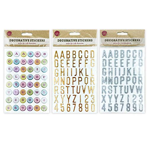 3 assorted packs, small colorful chipboard/silver glitter foam/gold foil thicker letters stickers., Each sheet size 5.5in x 3.9in, 3-Dimensional stickers., You can use them on scrap books, greeting cards, envelope, gift tags or gift box, wall, doors, kids room, posters, notebooks and more.