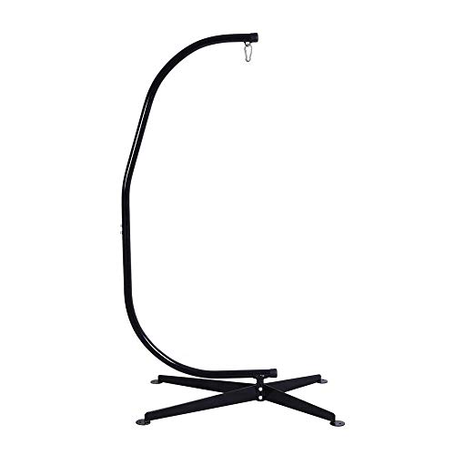 STABLE STRUCTURE - This hanging chair stand adopts an X-shaped base, this special design can ensure the stability of it. And the offset feet are fitted with holes for ground stakes(not included), which can enhance its stability in windy weather. Besides, it can bear about 300 pounds, so you can use this hammock C stand with confidence., HIGH-QUALITY MATERIAL - This swing chair stand is made of powder-coated steel and the frame connection is used hot-melt welding technology which made the support structure more strengthened. The plastic cap on the top of the tubing creates a soft finish and protects your safety during use better., 360 DEGREES ROTATION - The chair hammock stand gives you a nearly 360 degrees rotation ability, the safety hook can let you enjoy all angles of enjoyment at ease. Besides, the special shape design is suitable for variable kinds of hammocks and provides much space for your sitting, you can use this chair hammock stand in both indoors and outdoors., ASSEMBLE & DISASSEMBLE EASILY - This porch swing stand comes with easy-to-follow instructions, so you can quickly install and disassemble it. The overall size of this stand is 31"x44"x85", please note that the hammock should be installed at least 13.5-17.5 inches away from the ground., WARRANTY & SERVICE: Shipped in one box. All necessary hardware and instructions included. If you find any damage caused in transit or problem during assembly, please feel free to contact us via message and we will help you solve the problem within 24 hours.