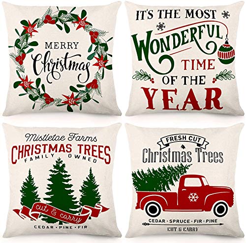 Package includes: Set of 4 Christmas throw pillow covers, single-sided printing, without any inserts or fillers., Material: high-quality cotton and linen material, soft and skin-friendly, no fading or abrasion, can be used outdoors., Size: 18x18inches/45x45cm, due to manual measurement and cutting, please allow an error of 1-2cm., Easy to install: Color-coordinated concealed/hidden zipper closure brings an elegant appearance, and it’s super easy to stuff pillows/fillers into this pillow cover., Great holiday products: Our Christmas pillow covers can help you quickly replace Christmas decorations. The unique Christmas elements design matches well with Christmas decorations. The perfect farmhouse style Christmas decorations are a must for your family and friends on holiday.