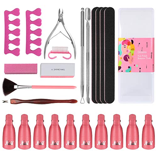 Complete Nail Polish Remover Kit; Contains a variety of tools for removing nail polish effectively and keeping nails well-groomed; You’ll get 1 stainless steel triangle gel scraper; 1 cuticle pusher; 1 cuticle nipper; 1 cuticle clippers; 10 nail polish remover clips; 4 double-sided nail buffer files; 2 nail brushes; 2 toe separators and 1 storage box(Plus 2 buffer block grits bonus ) , Convenient DIY Nail Polish Remover Kit For Home Use; Remove your gel polish fast and effectively at home instead of going out to salon; Save your money and time; Also reusable; The perfect set for taking care of your nails and a great gift for your mother/sister/friends , 10 Reusable Nail Polish Remover Clips; The clips hold the acetone-soaked cotton pads or balls firmly for effective polish removal without hurting the nail beds; Just clip on and wait for 10-15 minutes; No mess and no fussing with foils; Clean them once you’re done for save for next use, Professional Nail Buffers; Easily and comfortably trim your nails; natural or acrylic to your desired length and shape with the double sided nail buffer file; And polish with foam shiner buffer to make your nails neat; smooth and shiny effortlessly, Precisely Designed Cuticle Tools; The stainless steel cuticle tools are precisely designed and edged for great performance; Unique triangle head removes polish precisely without hurting your nails; while the spoon head pushes back skin at nail bed and the pointy head removes cuticle and residue polish easily