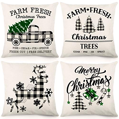 Package includes: 4 christmas black buffalo check plaid pillow covers, with only single-sided printing on the front, without any fillers and inserts., Size: 18x18 inches/45x45 cm, due to manual cutting and measurement, please allow 1-2cm error., Material: Made of high-quality cotton and linen, soft and breathable, strong and durable. Machine washable or can be washed by hand., Design: The hidden zipper design makes the whole pillow more beautiful., Applicable occasion: This set is the perfect farmhouse style Christmas decoration and a lovely gift for relatives and friends. It can be placed in your courtyard, garden, bench, bed, sofa, car, office, etc.