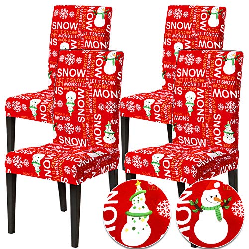 【Set of 4 Christmas Chair Covers】A set of 4 Christmas chair covers, printed with "LET IT SNOW", snowman and snowflakes. Specially designed for Christmas Chair Decoration., 【Suitable for Most Chair】Stretch dining chair covers fit most sizes of the dining chairs. Back Height: 17.7-23.6inch(45-60cm); Seat Width 15.7-19.7inch(40-50cm)., 【Easy to use】Simply put the chair covers on the chair, easily slip over the top of your dining chair and offer coverage from front to back. A quick and easy way to dress up the chair to add a festive atmosphere, 【Stretchable & Durable】Made of polyester with moderate softness. Stretchable, durable,reusable, comfortable and wrinkle resistant, no ironing required. Machine wash., 【Christmas Chair Decoration】Suitable for home, kitchens, Xmas family dining room, restaurant, Hotel, wedding banquet, dinner, meeting, celebration, ceremony,living rooms, or holiday party decoration, etc.