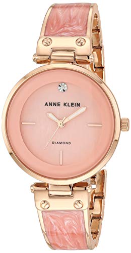 Slightly domed mineral crystal lens, Light pink mother-of-pearl dial with genuine diamond at 12; rose gold-tone luminous hands and markers, Rose gold-tone bangle with marbleized light pink enamel filling; adjustable end links; jewelry clasp and extender, Water resistant to 100 feet (30M)
