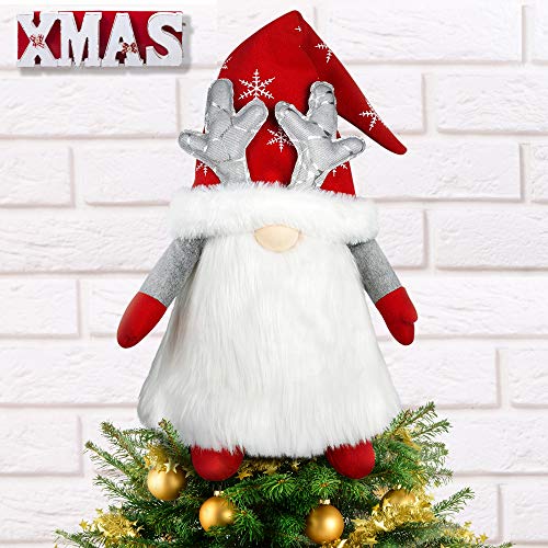 Lucky Gnome Christmas Tree Topper Decoration: Gnome is a universal symbol of luck and prosperity. In folklore, Gnome guards home and protect people from misfortune. It brings good luck to the family and is regarded as good luck. Gnomes are known for guarding earthly treasures and are ideal for protecting your Christmas tree or attracting health, love, and money., Light and Easy to Put on Top of Christmas Tree : It is 15.7’’ long for the Santa open arms. The top part is 27’’ long from the bottom. You just need to put the tree branches into head and hat so that they can stand up well. There is a wire on the arms and hat, you can pose him as you want. Bring it home now, have an impressive Christmas!, Charming Christmas Decorations: Swedish Tomte Gnome Christmas ornament is suitable for Christmas tree, wood stairs, door, stores, offices, hotels, restaurants, bars, and any other place that you want to decorate. Xmas tree topper is the great gift for your friends and family in the New Year, Christmas, Thanksgiving, birthday, Holiday Winter Wonderland Home Decor. The funny and cute style is sure to please everyone this Christmas., Reusable High-Quality Materials: The large Gnome tree topper is made of polyester, non-woven, plush, felt, and metal. Our Christmas tree topper can be reused, have it on your Christmas tree this each winter. Different from the traditional black hat, there are two cute antlers on the hat, which will undoubtedly add a more joyful atmosphere to Christmas. Your tree will be the most unique one in your neighborhood., Luck Gift: Gnome Christmas tree topper will bring lots of happiness to you and your family. You can also check our shop for more Christmas decorations, we offer gnome ornaments themes for you to choose from. If you have any dissatisfaction with the product or the size, we guarantee to return and give you a full refund.