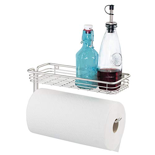 WALL MOUNTED PAPER TOWEL HOLDER: Keep paper towels within arm's reach in your kitchen, bathroom, craft room, laundry room, garage, or workspace. Features an additional storage shelf for soaps, candles, lotions, spices, cleaning supplies and products, medication, medical supplies, or additional paper towel rolls!, DURABLE: Rust-resistant stainless steel for long lasting use, STYLISH: Matte satin finish is fashionable and matches a variety of kitchen decor styles, INCLUDED HARDWARE: Includes all necessary mounting hardware for your convenience, IDEAL SIZE: Paper towel holder measures 12.25" x 5.25" x 5.25" for use in any kitchen