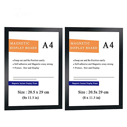 8 x 11.5 inches (with black border). Suitable for A4 paper. Both vertical and horizontal, the magnet on the frame edges is strong enough to keeps the pictures in place. No slide and move., Window frame design let you see the pictures clearly from the outside. Suitable for displaying Artwork, certificates, license, flowcharts, schedules, calendars to attract attention., Self-adhesive back can be stick to any smooth surface. Sticks well in glass, wood, and plastic. No trace is left after peeling. Peel off the back white protect paper., The magnetic can be durable use. Magnet design allows the product to be reused many times. Easy to attach and switch out pages.Made of double layer soft durable PVC plastic., We guarantee good quality and promise 12 month warranty. If you have any questions, please contact us and reply within 24 hours.