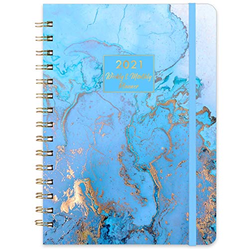 JANUARY - DECEMBER 2021 - Featuring 12 months of weekly and monthly pages and marked holidays. Weekly and monthly sections for easy planning and scheduling. Our 2021 planner also features a blue gilding design against a bright background., FUNCTIONAL DETAILS - Metal lay-flat twin-wire binding allows 360°folding over + 12 monthly tabs for quick checking + Quotes on the back inside pocket which can hold some cards + Elastic closure band to keep 2021 planner closed + Each weekly page offers ample lined writing space., PROFESSIONAL CONTENT DESIGN - 12 months of monthly pages with past and future monthly referencing + 12 months of ample lined weekly pages + 2021-2022 calendar overview + 2021-2023 holiday pages + 2 contact pages. This 2021 planner focus on meeting all your needs., SUPERIOR QUALITY - Thicker paper than normal paper in the market to reduce ink bleeding, erase fraying and shade issues + Bright white and acid-free paper, environmentally-friendly production with completely vegan raw material + Organize your life in style with this elegant gilding 2021 planner., OUR SERVICE - We will do our best to make you happy if you have any quality problems. All of these make the weekly & monthly planner a perfect choice for leading a clear life throughout the year. Give us a chance and let us show you a great 2021 planner experience!